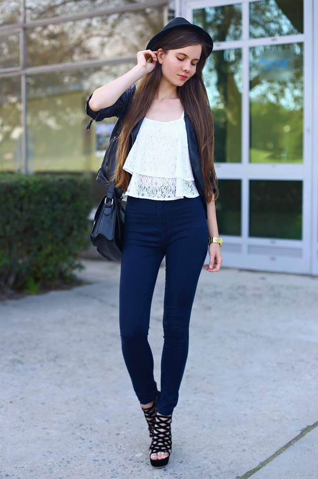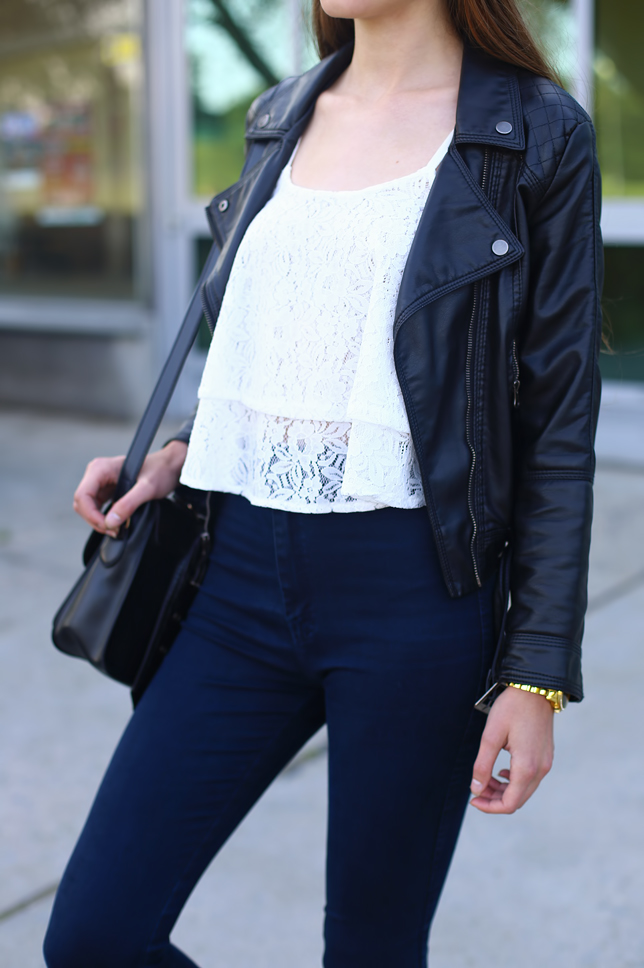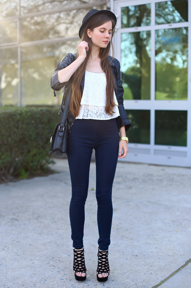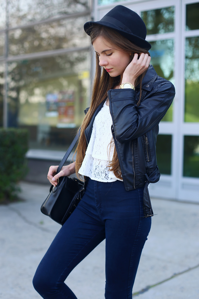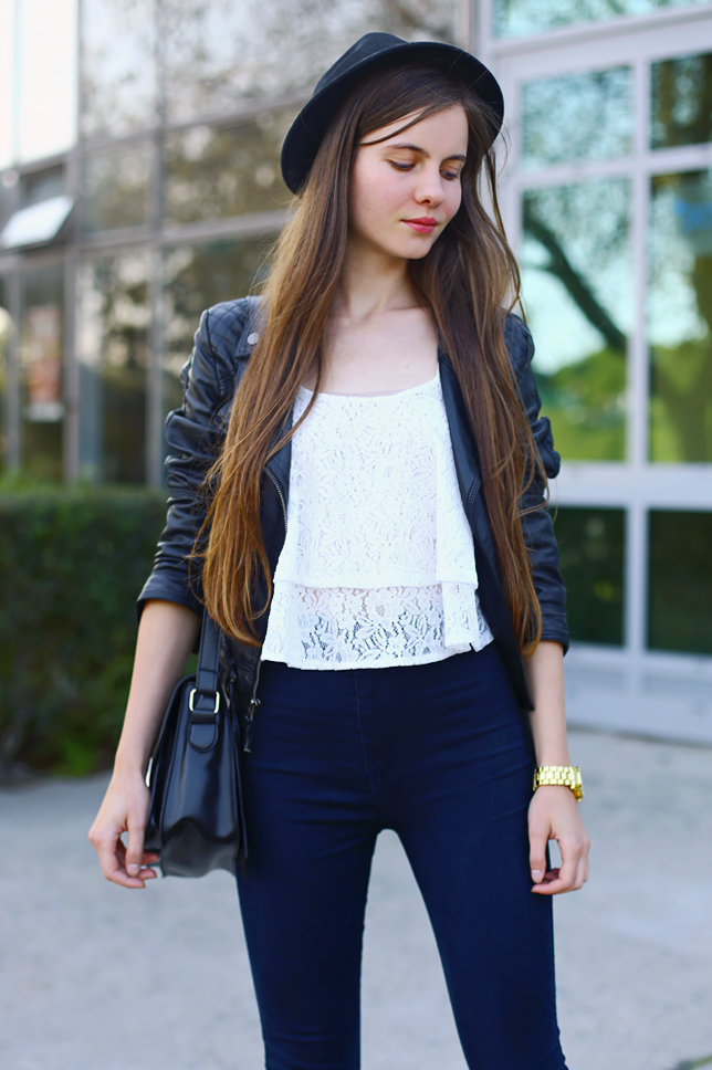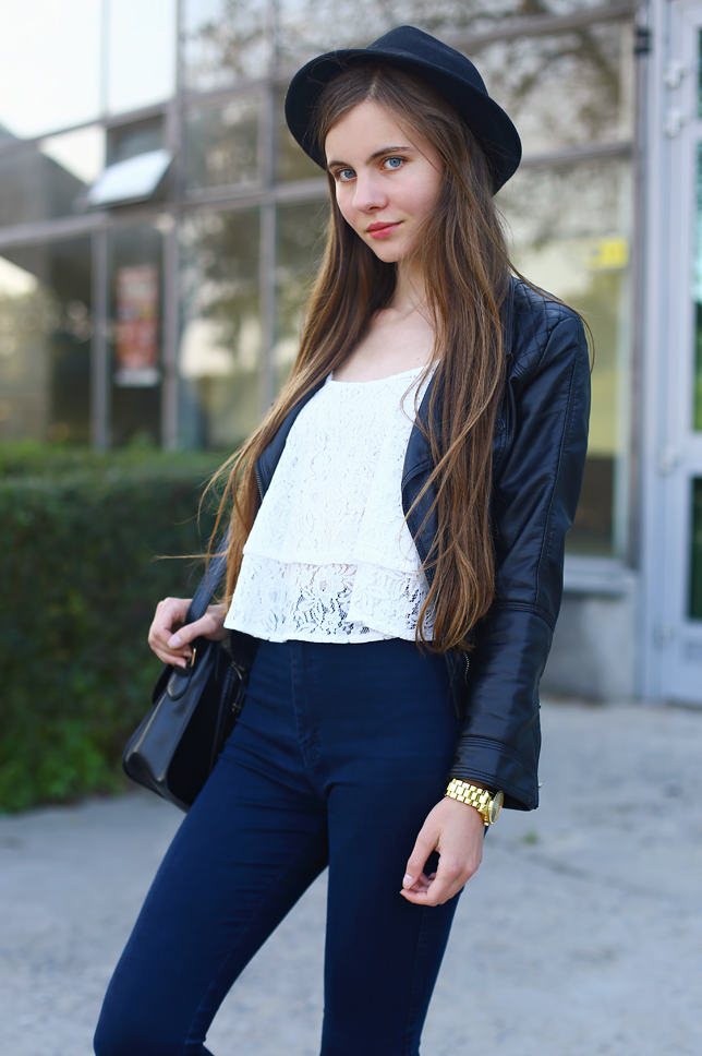 Poprzednia prosta stylizacja przypadła Wam do gustu, więc dziś mam dla Was kolejny zwyczajny zestaw. Ramoneska plus jeansowe rurki to po prostu klasyka. Chciałam jednak aby całość nabrała dziewczęcego charakteru, więc do owych elementów założyłam koronkowy biały top oraz zamszowe sandały na bardzo wysokim obcasie.