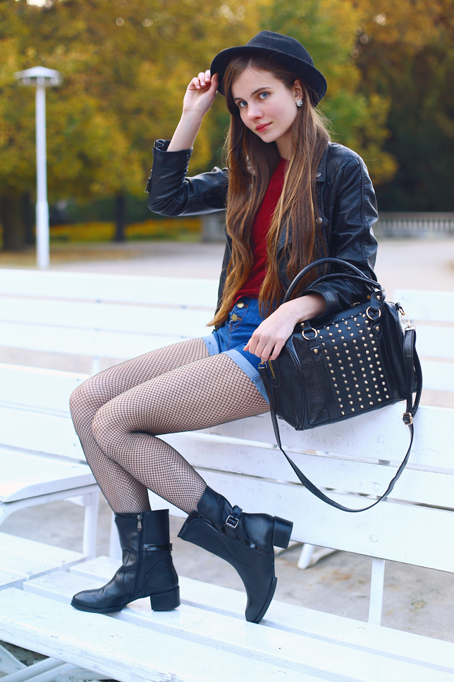 Mało osób wyobraża sobie paradowanie w kabaretkach na co dzień, jednak moim zdaniem warto czasami poeksperymentować z tym rodzajem rajstop, które wcale nie muszą wyglądać wulgarnie i wyzywająco. Jeśli odpowiednio dobierzemy pozostałe elementy stylizacji, rezultat może być bardzo ciekawy! :) Ja swoje zestawiłam z bordowym swetrem, jeansowymi szortami, ramoneską oraz skórzanymi butami z klamrami znalezionymi na Choies.com. Jak Wam się podoba?
