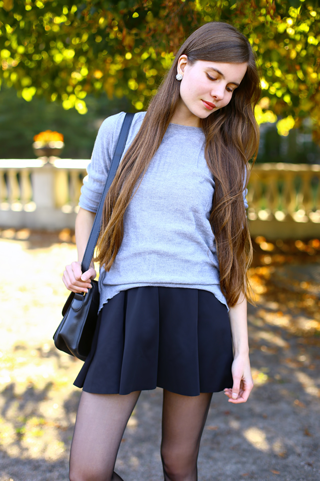 Zazwyczaj na blogu publikuję stylizacje ze szpilkami, ale to nie znaczy, że nie chodzę w płaskich butach. Te poniżej należą do moich ulubieńców - mogliście oglądać je na blogu już w zeszłym roku, ale jak widać wciąż świetnie się trzymają :) Ostatnio mam świra na punkcie klasycznych rozkloszowanych spódniczek - tę kupiłam niedawno na Tbdress.com za kilkanaście dolarów. Zestawiłam ją z wygodnym szarym swetrem z oryginalnym koronkowym tyłem oraz torebką listonoszką.