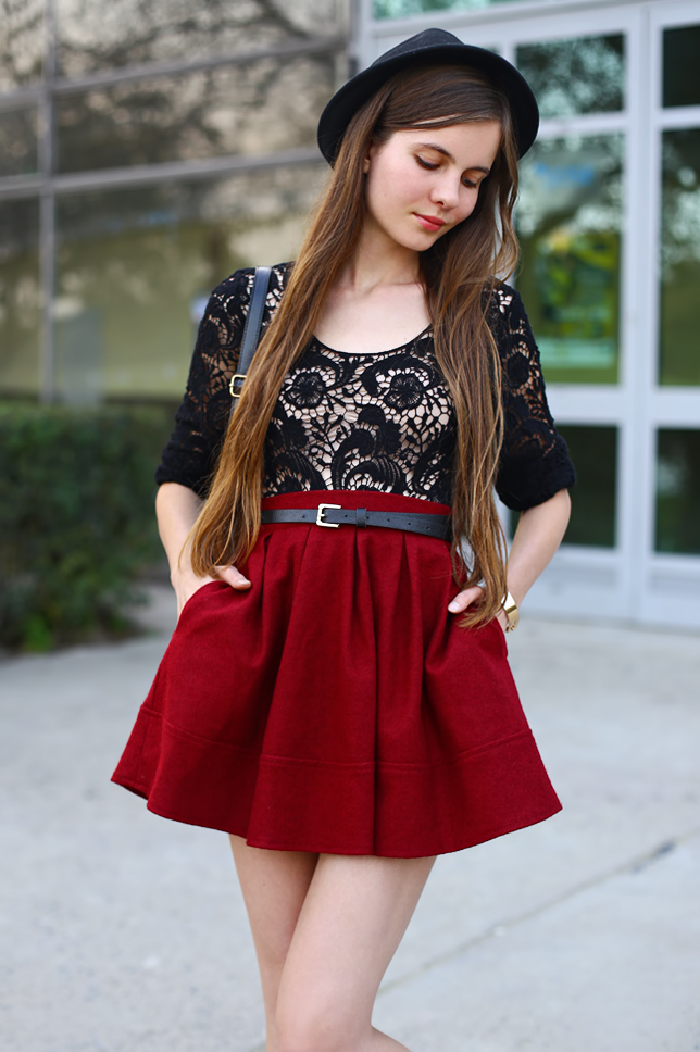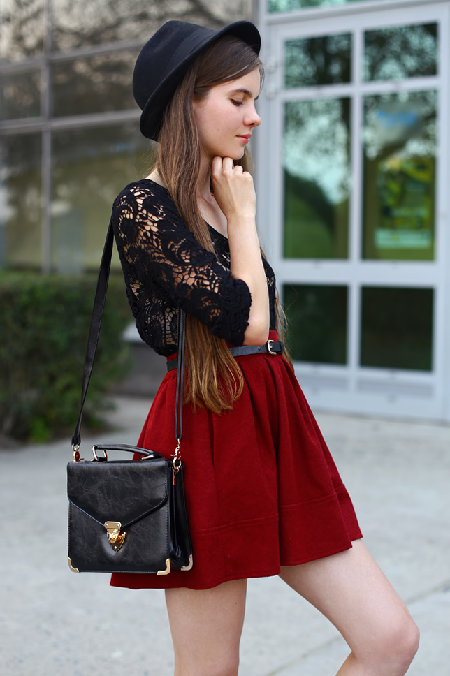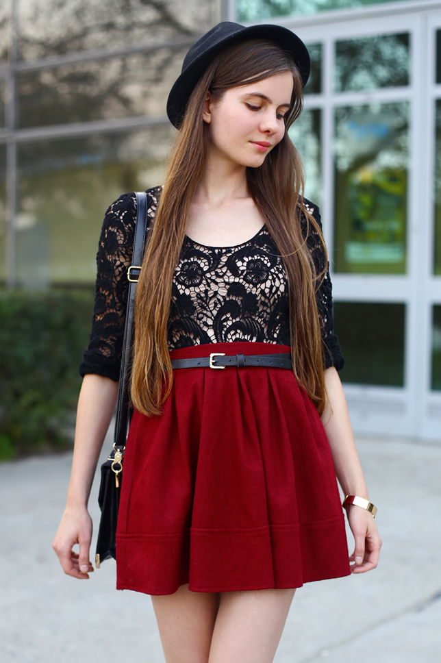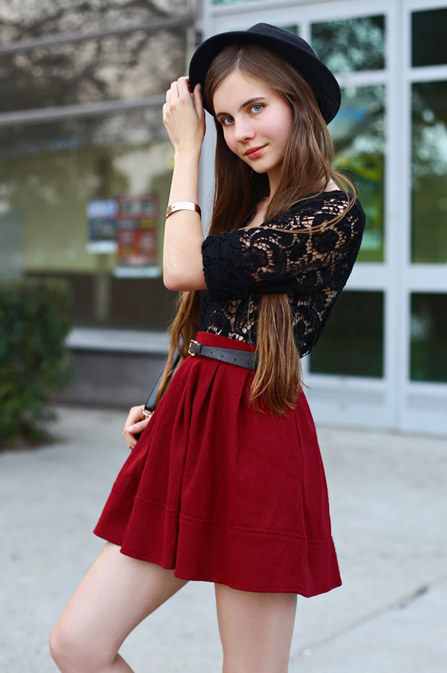 Pogoda dziś nie dopisała i niestety nie udało mi się przygotować nowych zdjęć. Mam więc dla Was coś z września :) Koronkową bluzkę mogliście oglądać już na moim blogu w zestawie z kwiecistym kombinezonem. Dziś wystąpi jednak w duecie z bordową rozkloszowaną spódniczką oraz moim ulubionym kapeluszem. Idealnym dopełnieniem zestawu okazały się lakierowane szpilki z czerwoną podeszwą.