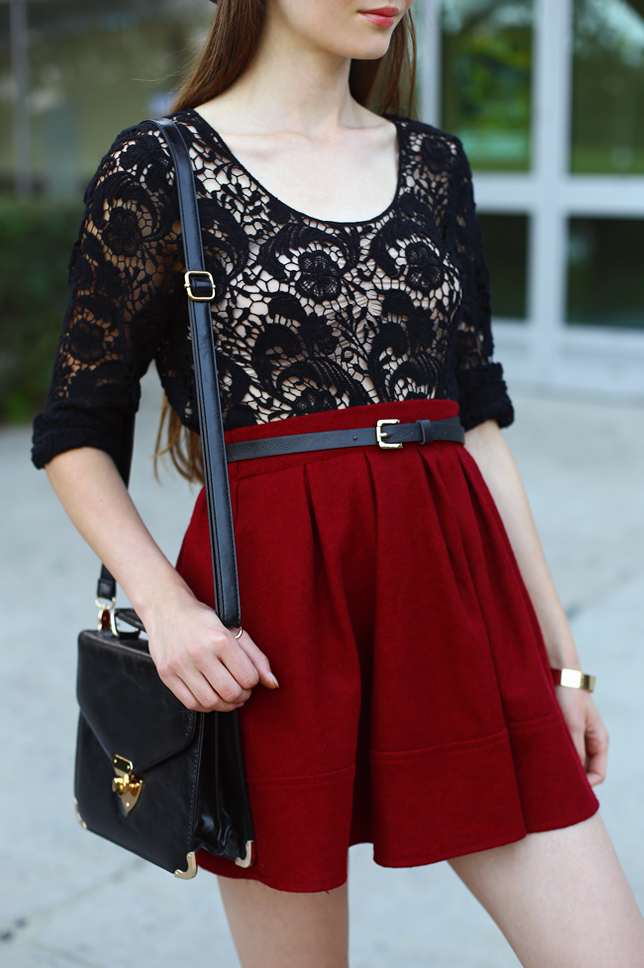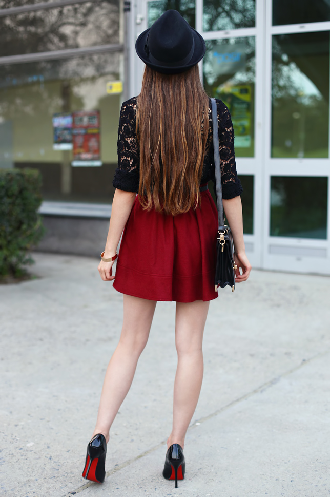 The weather today wasn't good so unfortunately I couldn't take new photos for you... but don't worry! I show you my outfit from September :) This lace blouse from Modekungen.com could you already see on my blog in a set with a floral jumpsuit. This time, I set it with a burgundy flared skirt from Oasap.com and my favorite black hat. I think that laquered pumps with the red soles from PersunMall.com look perfect with these three elements.