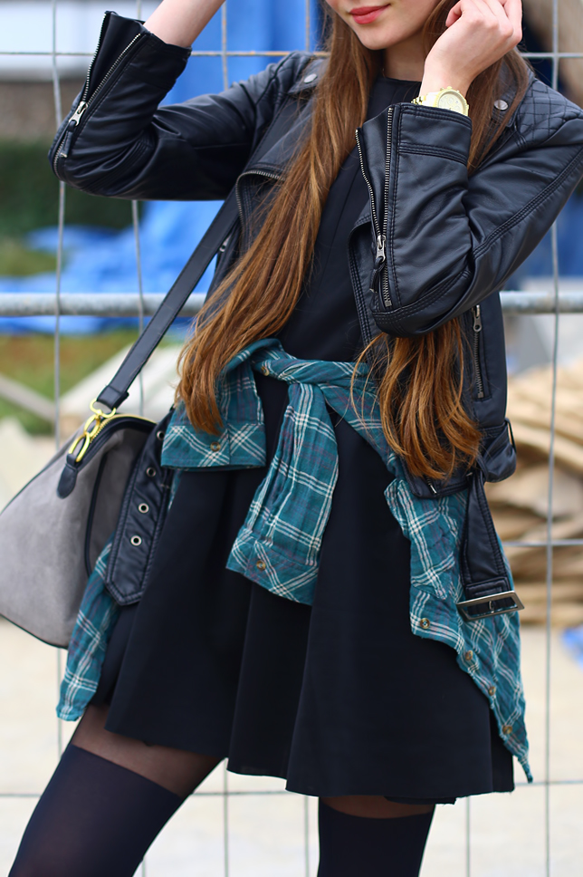 Bardzo fajna stylizacja. Ramoneska, sukienka, rajstopy i botki nadają jej uroku, natomiast wykorzystanie koszuli w kratę to dość oryginalny pomysł :-)
