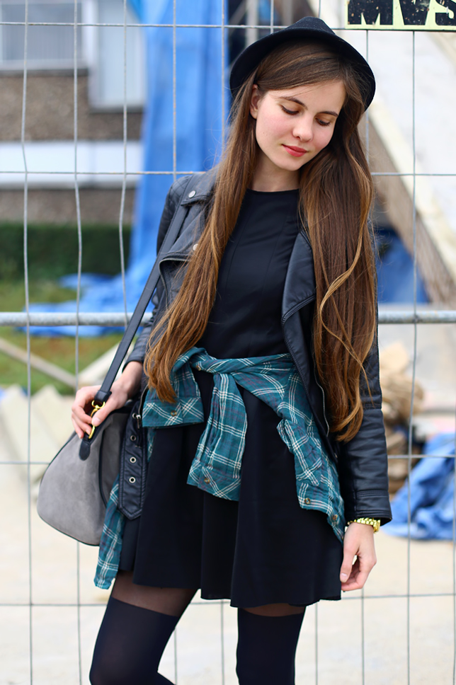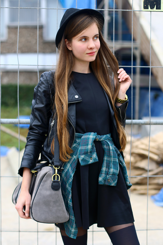 Today I want to show you my next set with a classic hat and a black flared dress (from Sheinside.com). As you can see, almost all the elements that I wore were in black, so I decided to add thereto any colored accent. Eventually, I wore a green plaid shirt that I tied at my waist and a grey suede bag from DressVenus.com.
