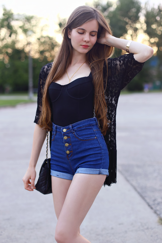 December has just begun, however I have for you photos from August. Do you remember that kimonos were trendy this summer? I hope next holiday such clothes will be popular again :) I bought this one at Choies.com. I wore thereto a black bodysuit from American Apparel and denim high-waisted shorts from Romwe.com.