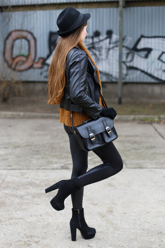 Nie sądziłam, że w grudniu będę miała jeszcze okazję założyć ramoneskę, którą zdążyłam schować głęboko do szafy. Wystarczyło jednak wdziać pod spód gruby ciepły cardigan i mrozy (oczywiście te lekkie) są już mi nie straszne ;) Sweter urzekł mnie swoim kolorem, materiałem z którego został wykonany oraz oryginalnym asymetrycznym kołnierzem. Zestawiłam go z kontrastującymi błyszczącymi legginsami, zamszowymi butami na masywnym obcasie oraz ulubionym kapeluszem.