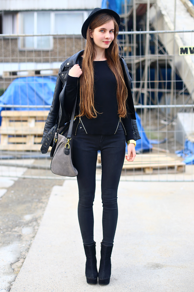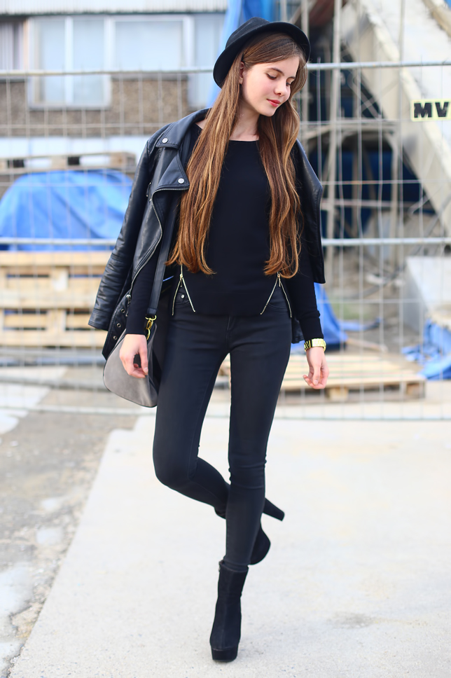 Gdyby nie szara torebka, byłabym ubrana w czerń od stóp do głów. Sweter z zamkami znalazłam parę miesięcy temu w Butiku. Moim zdaniem taki fason najlepiej prezentuje się z dopasowanymi spodniami. Na wierzch zarzuciłam skórzaną kurtkę, choć przy obecnej pogodzie lepiej sprawdziłby się ciepły płaszcz ;)