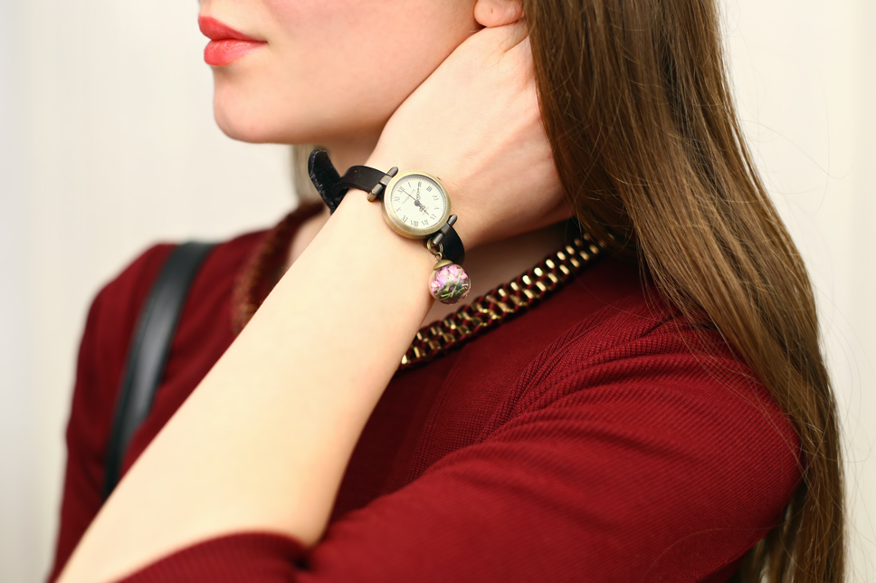 Ostatnio mam pecha i wiele z sukienek, które zamawiam okazuje się ekstremalnie krótkich ;) Mimo wszystko, tą widoczną poniżej musiałam się z Wami podzielić, ponieważ bez wątpienia zasługuje na uwagę. Spodobał mi się jej piękny głęboki kolor oraz zdobiona góra. Dobrałam do niej eleganckie czarne dodatki, wśród których znalazł się ręcznie wykonany, niezwykle oryginalny zegarek marki MadamLili.