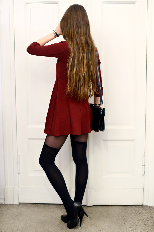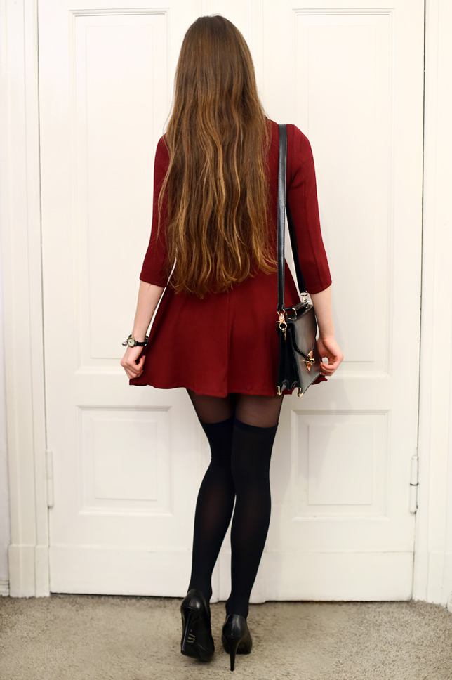 Recently a lot of dresses that I ordered lately are extremely short ;) This one I found at Romwe.com. Charmed me with the beautiful deep color and a nice gold collar. I wore thereto elegant black accessories: leather pumps, an elegant bag from Choies.com and a handmade, original wrist watch by MadamLili.