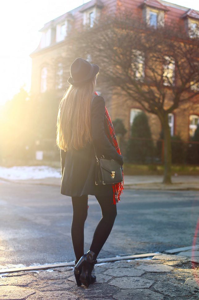 Today was a sunny day so I could take a few photos for you. I like minimalist, girly outfits. Sometimes, it's good idea to add thereto one distinctive element. My set is consists of a casual grey blouse, a leather flared skirt from Choies.com and a classic black coat from Sheinside.com. Look on my long red plaid scarf from Oasap.com - thanks to it, I can stand out in the crowd! :)