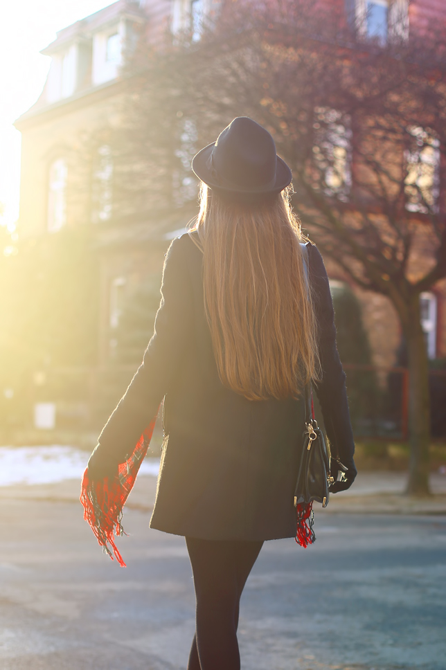 Dzisiejszy dzień, choć dość zimny, był wyjątkowo słoneczny :) Dzięki temu udało mi się wykonać trochę zdjęć podczas dzisiejszego spaceru. Lubię minimalistyczne, dziewczęce zestawy. Czasami jednak warto przełamać je jakimś wyrazistym elementem. Ja zdecydowałam się na długi czerwony szal w kratę - szukałam takiego od dawna!