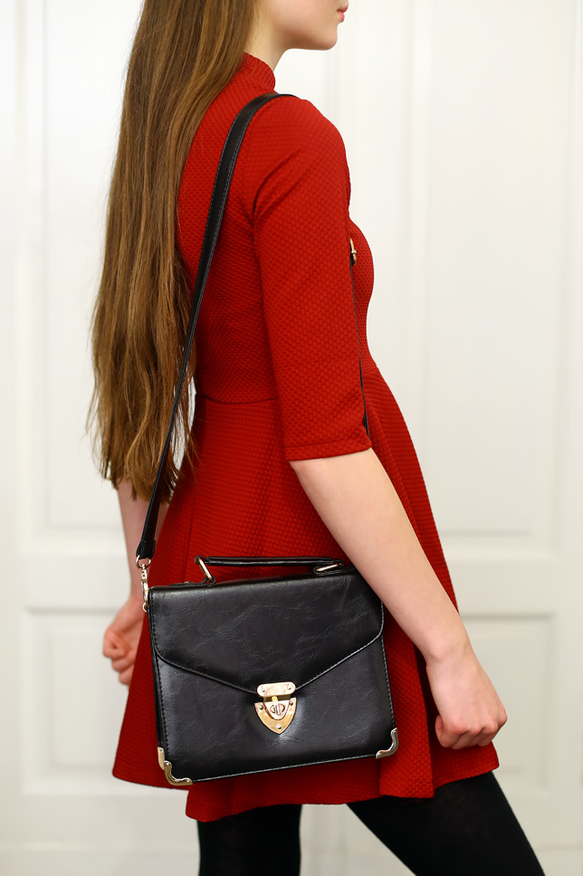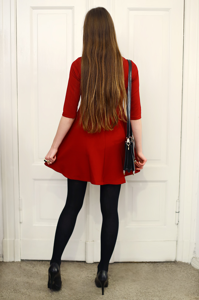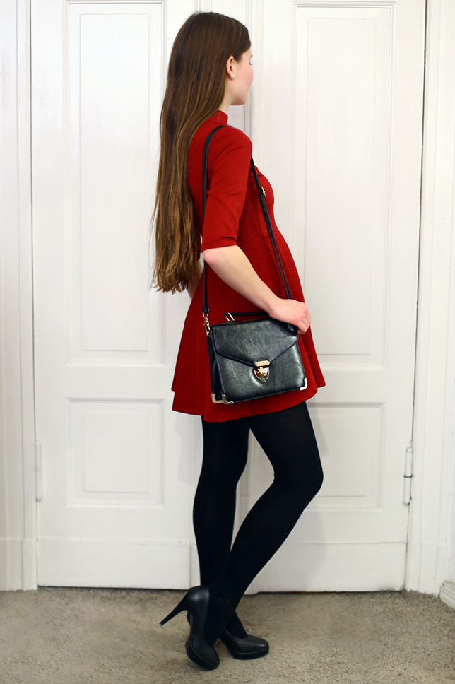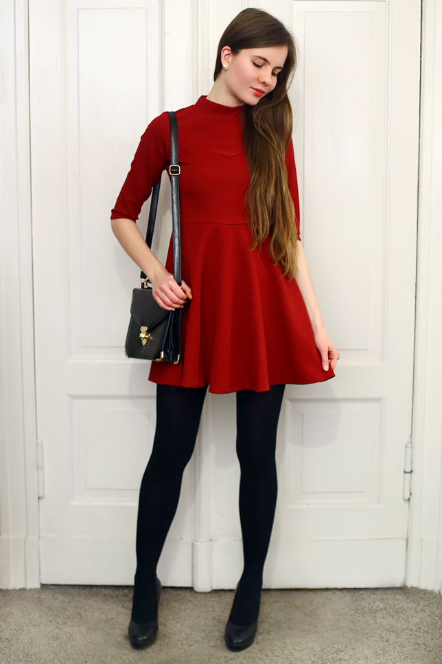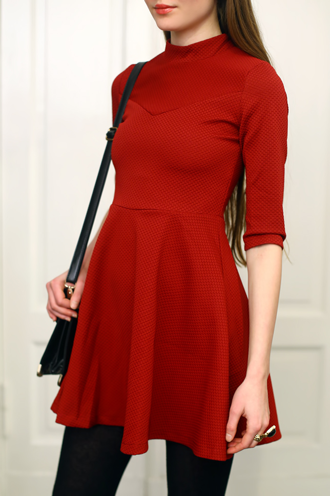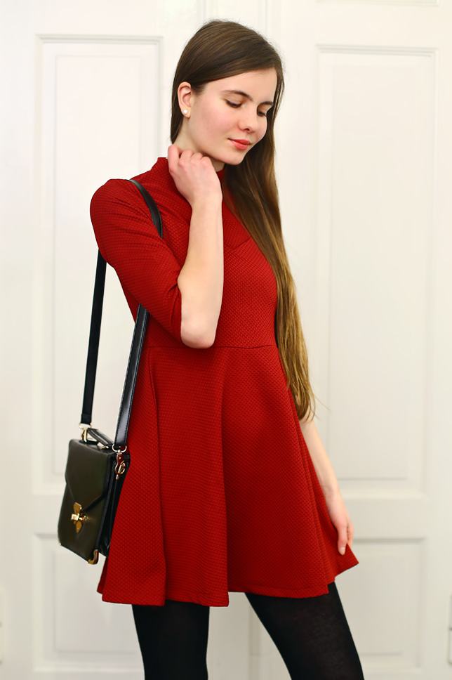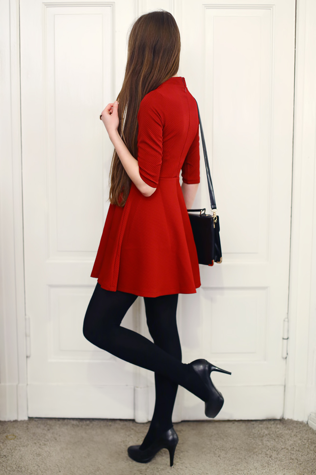 You don't have to give up dresses in winter. Just look for those made of thick fabric. This red dress with stand-up collar from Sheinside.com caught my attention not only because of the color, but also the original cut. I decided to wear thereto elegant simple elements: black tights, leather pumps, a small bag and delicate jewelry.