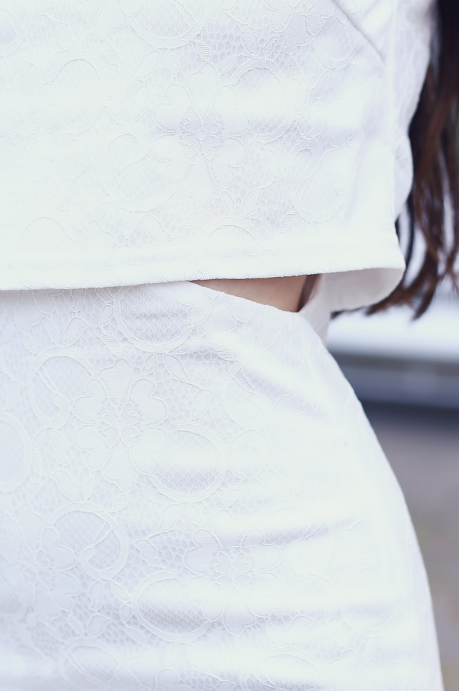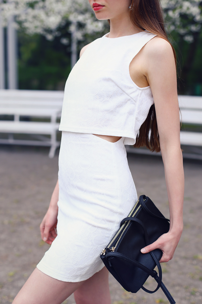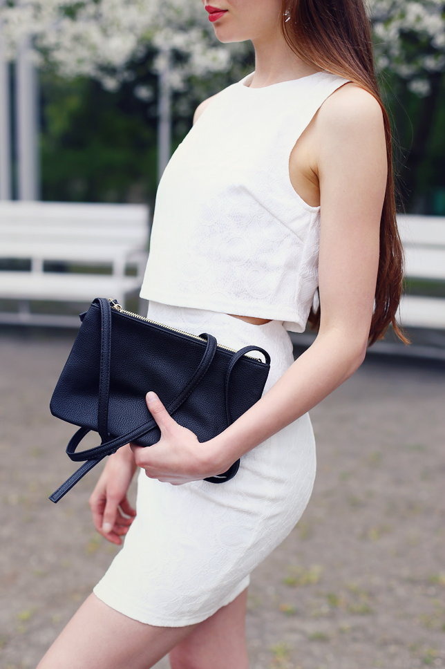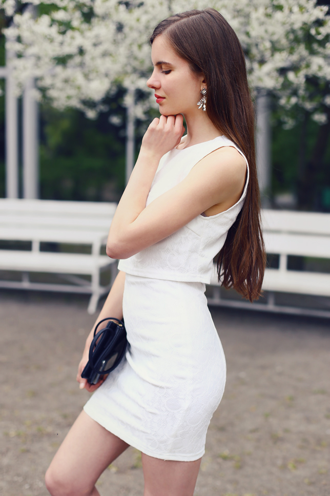 White and black are the most timeless colors. I think that the former is underestimated, so when I noticed that I don't have many bright clothes, I decided to change it! In the end, I bought an original dress at AXParis.co.uk. It looks like a set consisting of a crop top and a matched high-waisted skirt, right? I set it with a lacquered pumps, a simple clutch and amazing crystal earrings from HappinessBoutique.com.