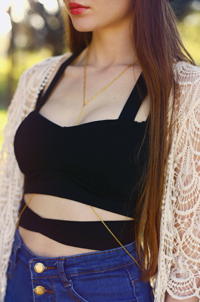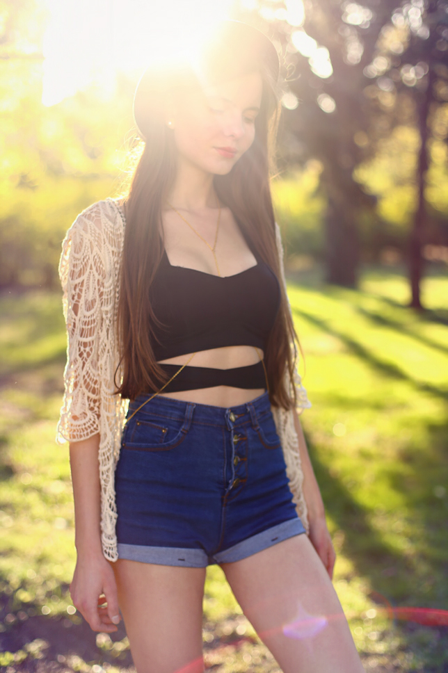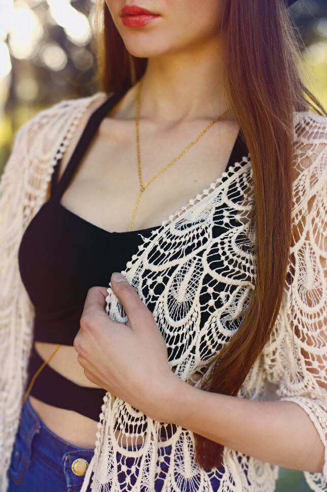 Lubię kiedy wszystkie elementy stylizacji tworzą spójną całość. Choć takie zestawy są poprawne, czasami mogą wydawać się nieco nudne. Skusiłam się więc na mały eksperyment i postanowiłam połączyć ze sobą ubrania oraz dodatki z zupełnie różnych bajek. Koronkowy subtelny cardigan plus czarne sportowe buty, a do tego jeansowe szorty, klasyczny kapelusz i złoty łańcuszek na ciało? Brzmi ciekawie, a jak wygląda? Oceńcie sami :)