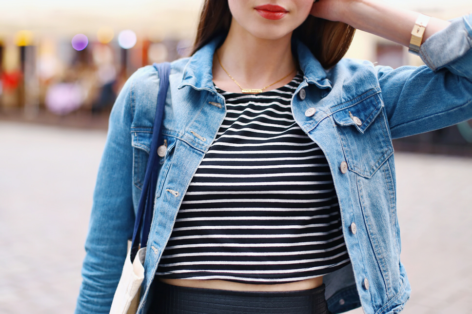 Today exceptionally I have for you photos of my casual set that I wore at the weekend. As you can notice, I very like this mini leather skirt from Choies.com, simple denim jacket from Sheinside.com and black Nike Air Max sneakers. They are some of my favorite pieces of clothing recently! New elements of my outfit are a striped crop blouse that I bought for just a few dollars at Newdress.com and a linen shopping bag from Lee.