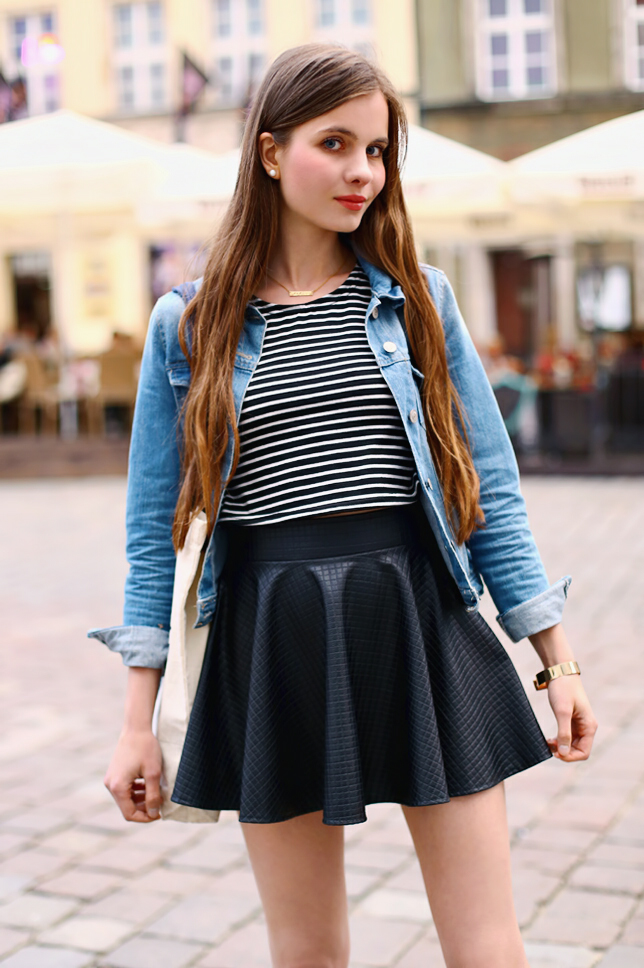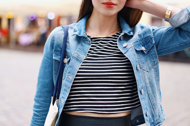 Dziś dla odmiany mam dla Was zwykły codzienny zestaw, który miałam na sobie podczas jednego z weekendowych wypadów. Pewnie zauważyliście, że bardzo polubiłam widoczną poniżej skórzaną spódniczkę, jeansową kurtkę i czarne sportowe buty. To ostatnio jedne z moich ulubionych elementów garderoby! Nowością jest natomiast krótka bluzka w paski, którą kupiłam za zaledwie kilka dolarów w internecie. Z pewnością jeszcze zobaczycie ją na blogu :)