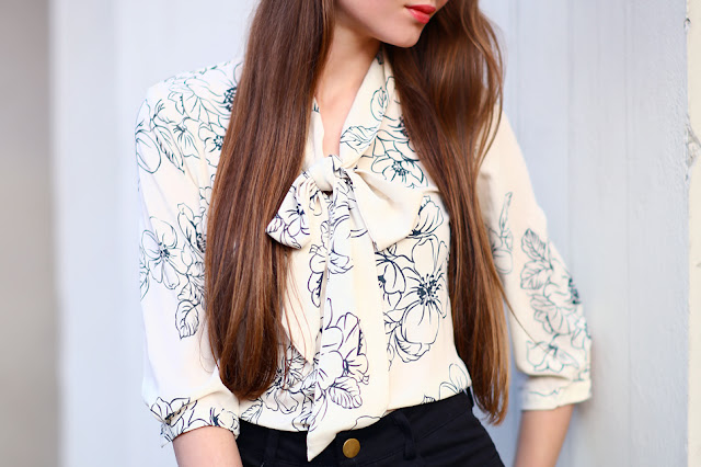 Some people think that the combination of shorts and tights is unacceptable. Are they right? I think these elements arranged in a suitable manner can present extremely elegant and very feminine. The classic high-waisted shorts and black seamed nylons look really pretty. Thereto I decided to wear a beige shirt with a pussy bow from StyleMoi.nu and a quilted handbag from Arafeel.com.