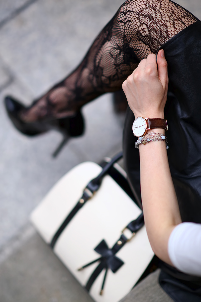 Po kilku kolorowych stylizacjach, znów powracam do nieśmiertelnego duetu bieli z czernią. Połączenie jasnej bluzki ze skórzaną spódniczką być może nie należy do zbyt oryginalnych, dlatego postanowiłam urozmaicić je interesującymi dodatkami. Oprócz uroczej torebki z kokardką i ręcznie wykonanej bransoletki, skusiłam się na koronkowe, przyciągające wzrok rajstopy. Przyznam, że nigdy nie byłam wielką zwolenniczką tego typu wzorów, ale postanowiłam zaryzykować i poddać się Waszej ocenie ;) Zdjęcia wykonałam przy szkole baletowej w Poznaniu.
