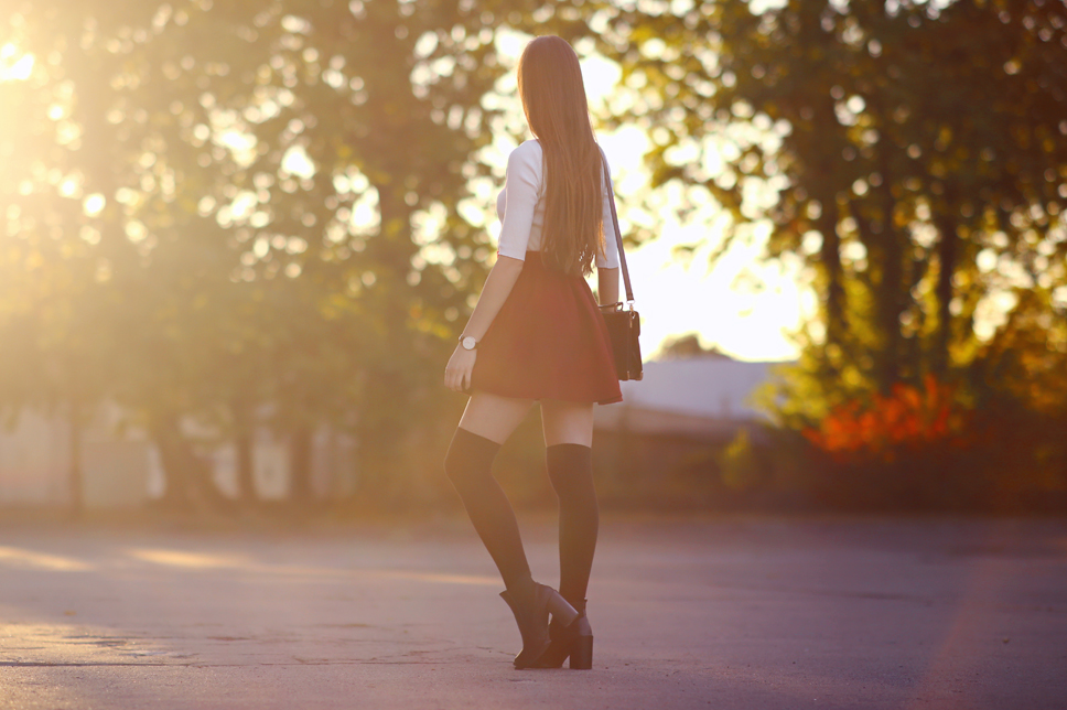 If you follow me on Instagram, you probably seen a short movie from this photo session. The last day of September was exceptionally beautiful so I took off a coat and I prepared for you a few photos of my yesterday's outfit. A white blouse from Choies.com at first glance looks ordinary, but just look at the back - is very lovely! I wore thereto a burgundy skirt from Oasap.com and black boots from Chicwish.com. Do you like over knee socks? In the near future I want to publish more outfits with them.