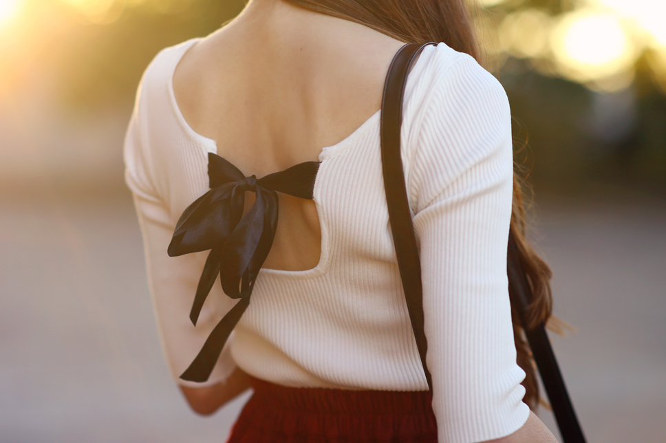 Jeśli śledzicie mnie na Instagramie, z pewnością widzieliście krótki film z poniższej sesji. Ostatni dzień września był wyjątkowo piękny. Taką jesień to ja lubię ;) Na chwilę zrzuciłam więc płaszcz i przygotowałam dla Was zdjęcia zestawu, który miałam wczoraj na sobie. Biała bluzka na pierwszy rzut oka wygląda po prostu zwyczajnie, ale wystarczy spojrzeć na tył - czarna kokarda prezentuje się niezwykle uroczo! Tęskniliście za zakolanówkami? W najbliższym czasie z pewnością będą częściej gościć na blogu.