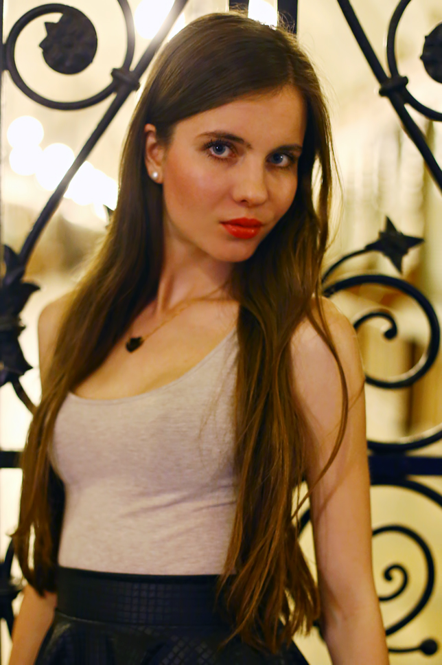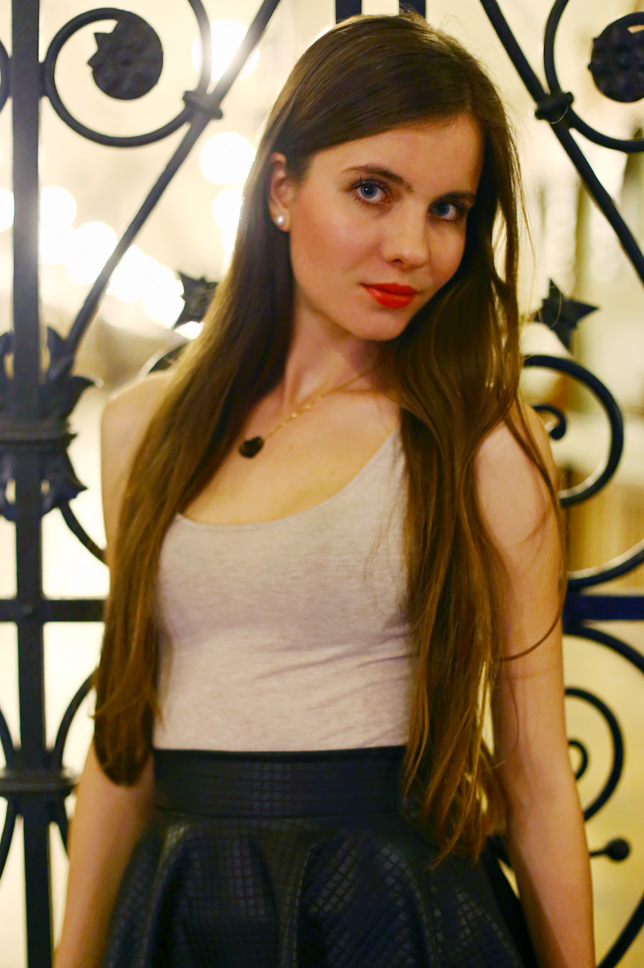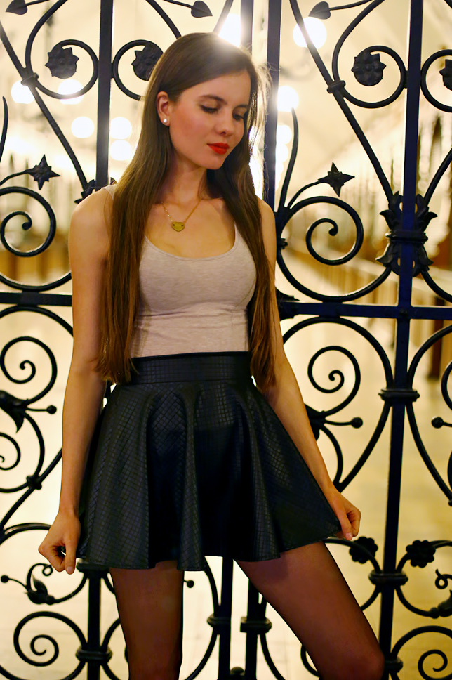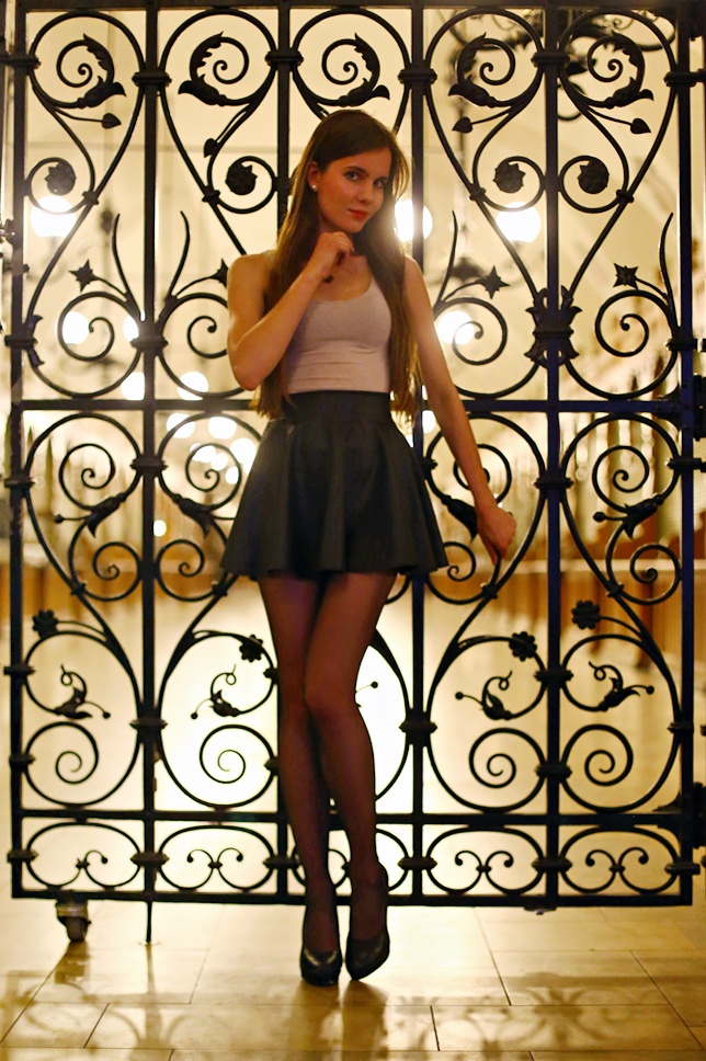 Today I prepared something special for you. This is my first photoshoot, that I took at night, in addition in a unique place - at the Cloth Hall in Cracow. I prepared these photos in May. My outfit is very simple: a beige top from H&M, a flared leather skirt from Choies.com, black tights from Beli.pl and classic pumps... Isn't original! Often, however, the simplest combinations are the best :)