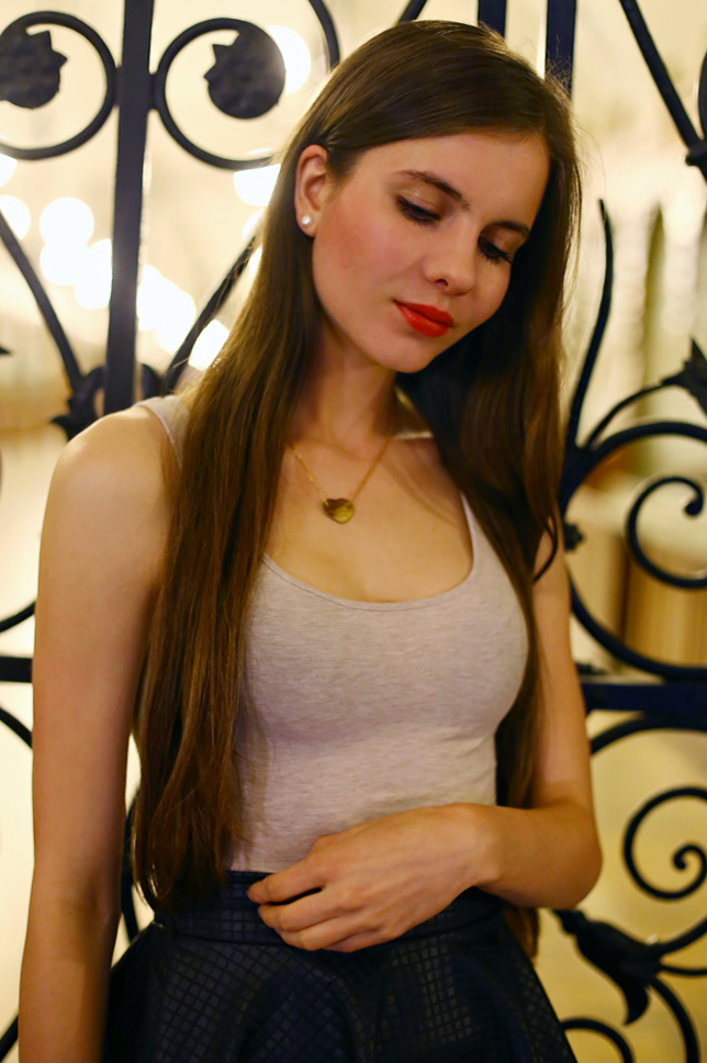 Dziś przygotowałam dla Was coś specjalnego. To moja pierwsza sesja, którą wykonywałam w nocy, w dodatku w wyjątkowym miejscu - przy Sukiennicach w Krakowie. Spokojnie, nie zmarzłam - zdjęcia powstały w maju ;) Zestaw, który mam na sobie nie należy do zbyt skomplikowanych. Zwykły jasny top, rozkloszowana spódniczka, czarne rajstopy i klasyczne szpilki to połączenie jakich wiele... Często jednak to właśnie najprostsze rozwiązania są najlepsze.