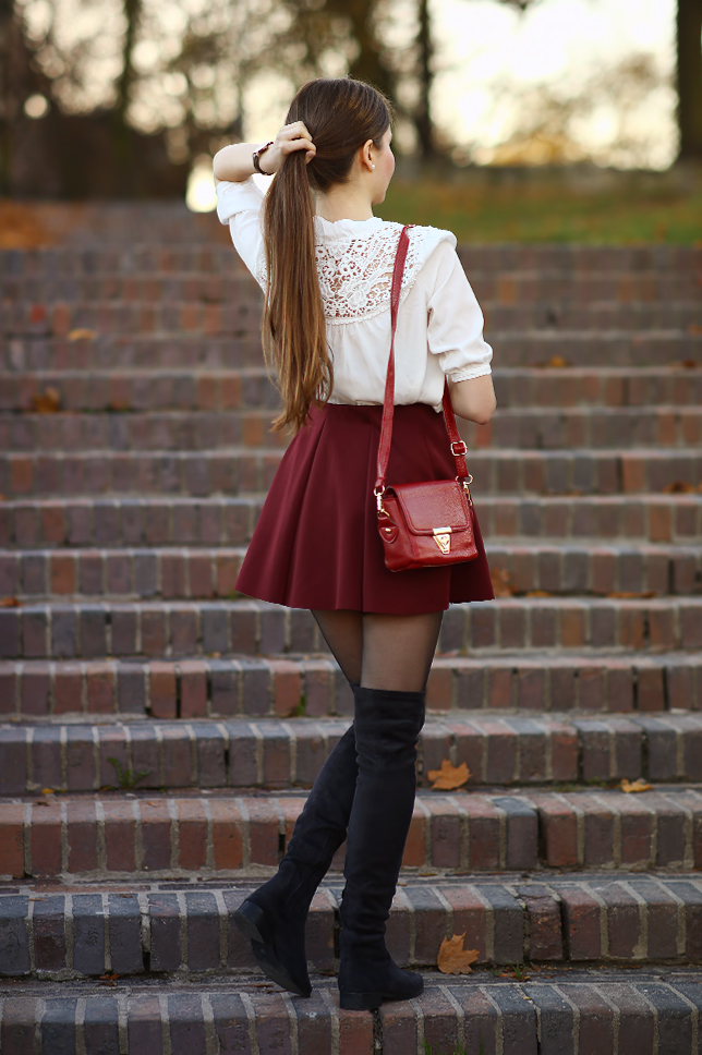 Przez długi czas nie dzieliłam się z Wami stylizacjami z płaskimi butami, a przecież takie także znajdują się w mojej szafie :) Zimą do moich ulubieńców należą długie wygodne kozaki, które idealnie pasują do sukienek, spódniczek oraz czarnych rajstop. Dziś zobaczycie je w dziewczęcym zestawie z białą koronkową koszulą oraz krótką bordową spódniczką.