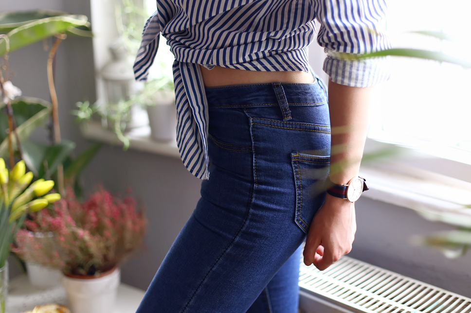 Pants are one of the most popular element of many people's wardrobe, but I wear them rarely. Today I want to show you my casual simple outfit. A boyfriend striped shirt from Romwe.com and skinny denim pants from Romwe.com looks very sexy thanks to high-heeled shoes. Instead of my favorite black pumps, I decided to wear blue heels from eButik.pl. Would you like to see them more often?