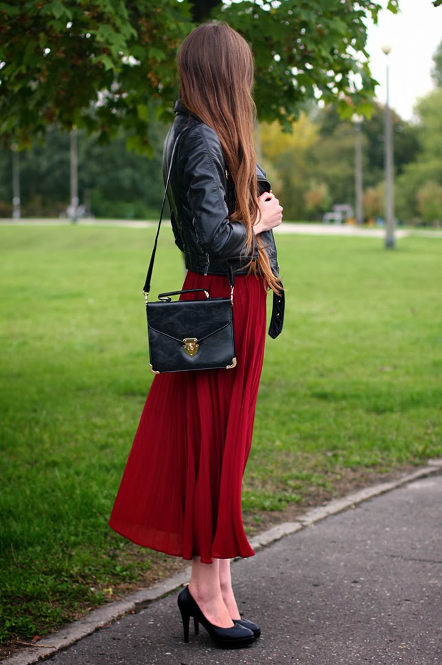 A few months ago, I had an obsession with maxi skirts and dresses - so I bought a bordeaux pleated skirt from Ecugo.com. It's pefect for the autumn time! :) I combined this skirt with a cream sweater from Vj-Style.com, a black leather jacket from H&M and an elegant vintage bag from RoseWholesale.com.
